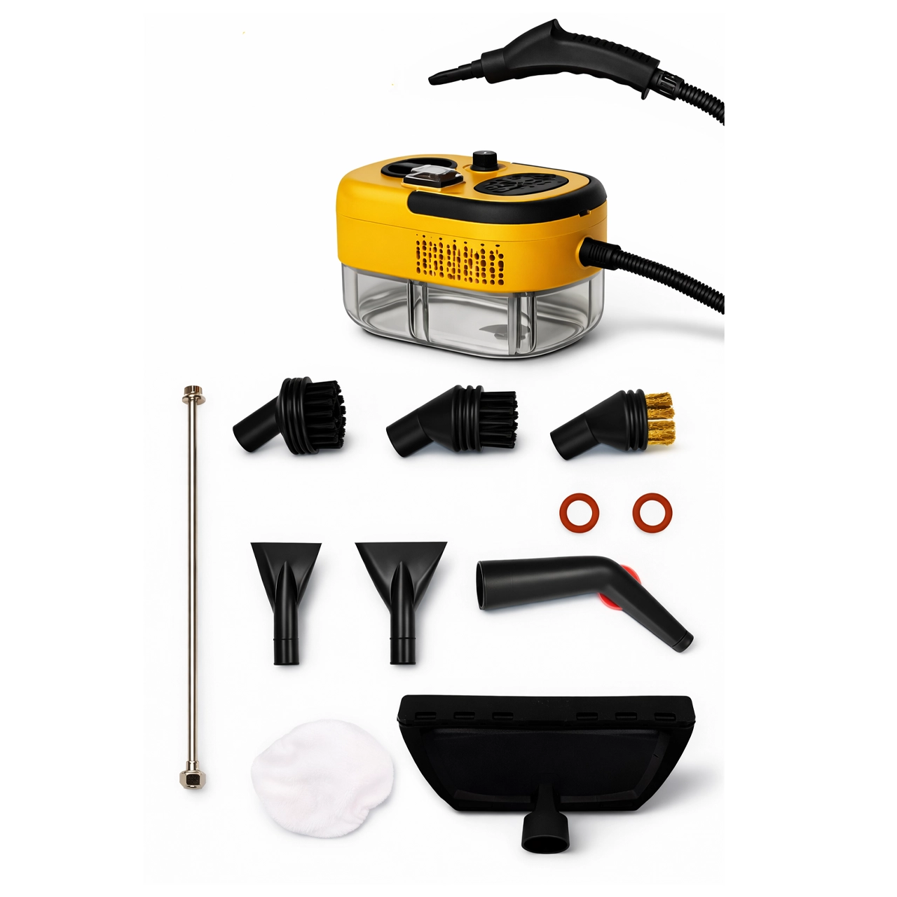 يأتي الجهاز مع مجموعة من الملحقات الشاملة مثل الفوهات المختلفة، الفرشاة النيلونية، فرشاة نحاسية، فوهة ضغط عالي، خرطوم بخار طويل، قضبان التمديد، ومكشطة للزجاج؛ ما يسمح لك بالتعامل مع أنواع متعددة من الأسطح والزوايا الضيقة بسهولة.