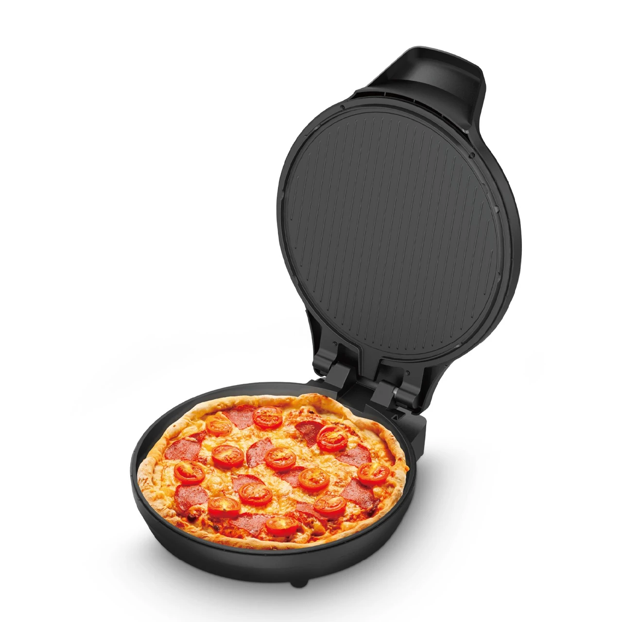 نظام 2 في 1 (Double Function): يمكنكِ استخدامها كخبازة مغلقة للبيتزا والخبز العربي للحصول على حرارة من الأعلى والأسفل، أو فتحها بزاوية 180 درجة لتحصلي على مساحتي عمل (جريل مسطح) في آن واحد.