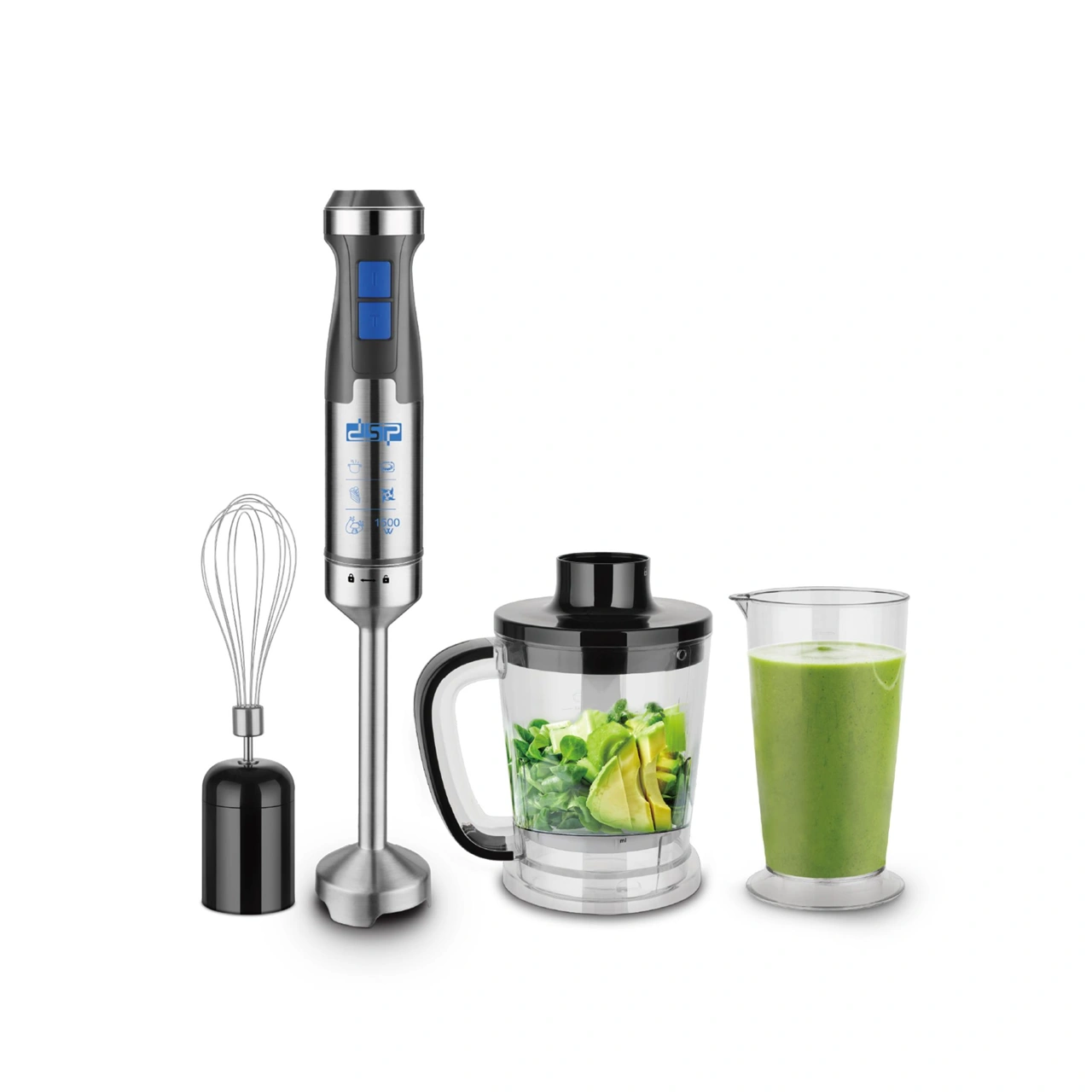 هاند بلندر DSP قوة 1500 وات 4 في 1 – القوة الجبارة لتحضير طعامكِ بلمسة احترافية. انتقلي بمطبخكِ إلى مستوى جديد من السرعة مع DSP KM1172. يتميز بمحرك توربو هو الأقوى في فئته بقدرة 1500 وات، ليمنحكِ أداءً لا يضاهى في الخلط، الفرم، والخفق. بفضل تصميمه المتين ومجموعة الملحقات المتكاملة (الخلاط اليدوي، المفرمة، المضرب، ووعاء القياس)، ستتمكنين من تحضير الشوربات، اللحوم، والحلويات بمنتهى السهولة والقوة، ليكون الرفيق المثالي للمهام الشاقة اليومية.